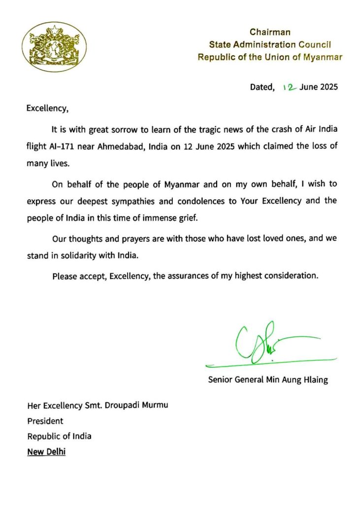 နိုင်ငံတော်စီမံအုပ်ချုပ်ရေးကောင်စီဥက္ကဋ္ဌ နိုင်ငံတော်ဝန်ကြီးချုပ် ဗိုလ်ချုပ်မှူးကြီး မင်းအောင်လှိုင်သည် ၁၂-၆-၂၀၂၅ ရက်တွင် အိန္ဒိယသမ္မတနိုင်ငံ အမီဒါဘတ်မြို့အနီး၌ အိန္ဒိယလေကြောင်း AI-171 ပျက်ကျခဲ့မှုကြောင့် လူပေါင်းများစွာ အသက်ဆုံးရှုံးခဲ့ရမှုများအတွက် ဝမ်းနည်းကြောင်းသဝဏ်လွှာကို အိန္ဒိယသမ္မတ နိုင်ငံသမ္မတ ရှရီမတီ ဒရောပါဒီ မာမူထံသို့ ပေးပို့သည်။